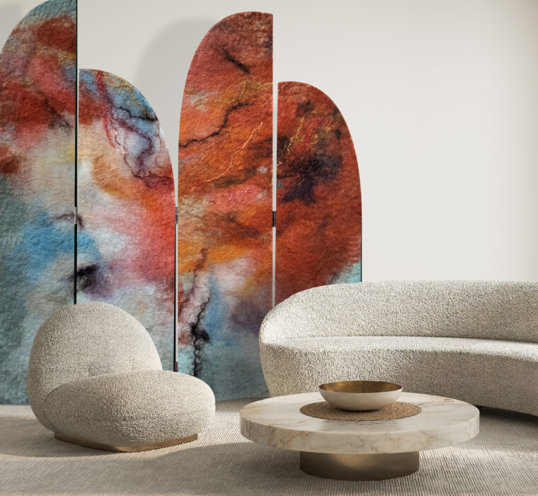 La richesse des applications de la laine s’y est déployée dans le renouveau joyeux et poétique des tapisseries d’Aubusson de l’Atelier Cc Brindelaine, l’élégance onirique des revêtements muraux en Nuno Silk de OOLMOO, l’intensité graphique des tissages de La Tisserie, la naturalité singulière des pièces maille et feutre de Ghislaine Garcin, les tapis tissés au rythme de la nature de Laines Paysannes, l’univers coloré et Art Déco des courtepointes d’Isabelle Boubet, ou encore l’harmonie des formes et couleurs des tapis tuftés de Jory Pradelle.